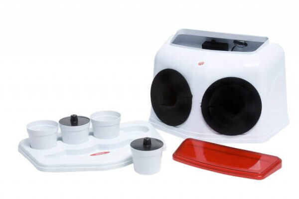 - 4 reservatórios para líquido (água, removedor, fixador e água)